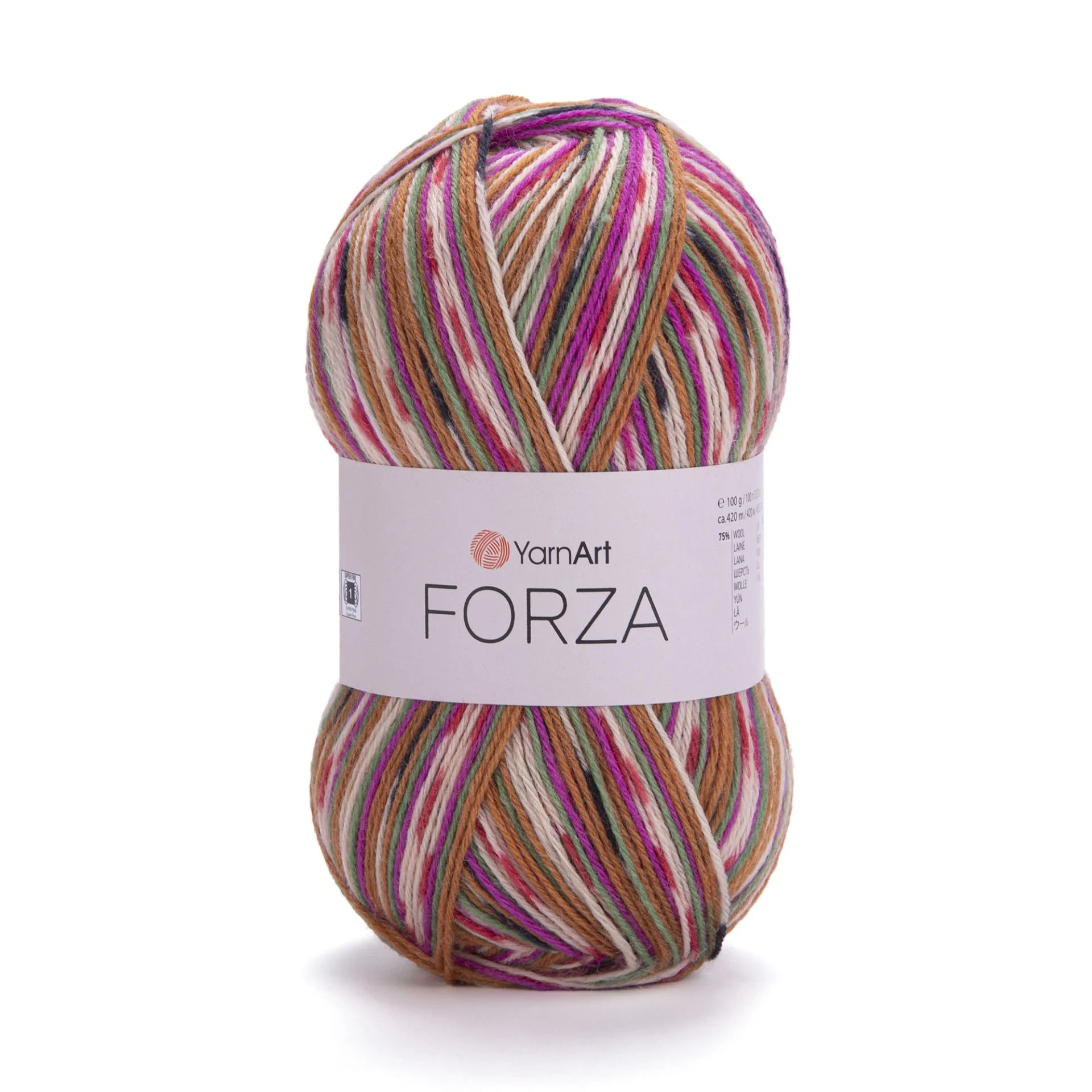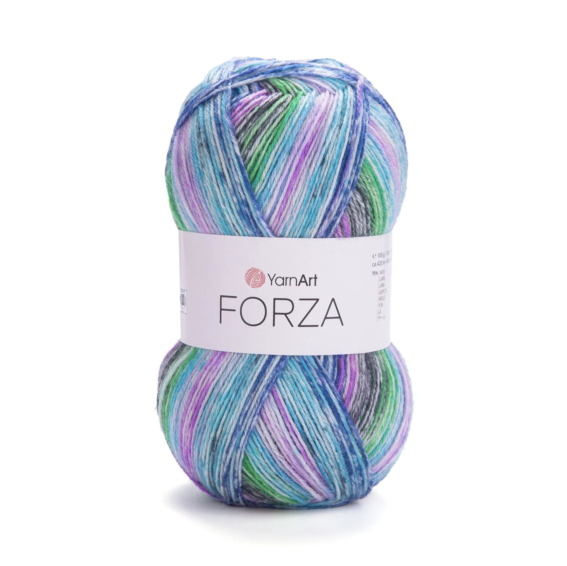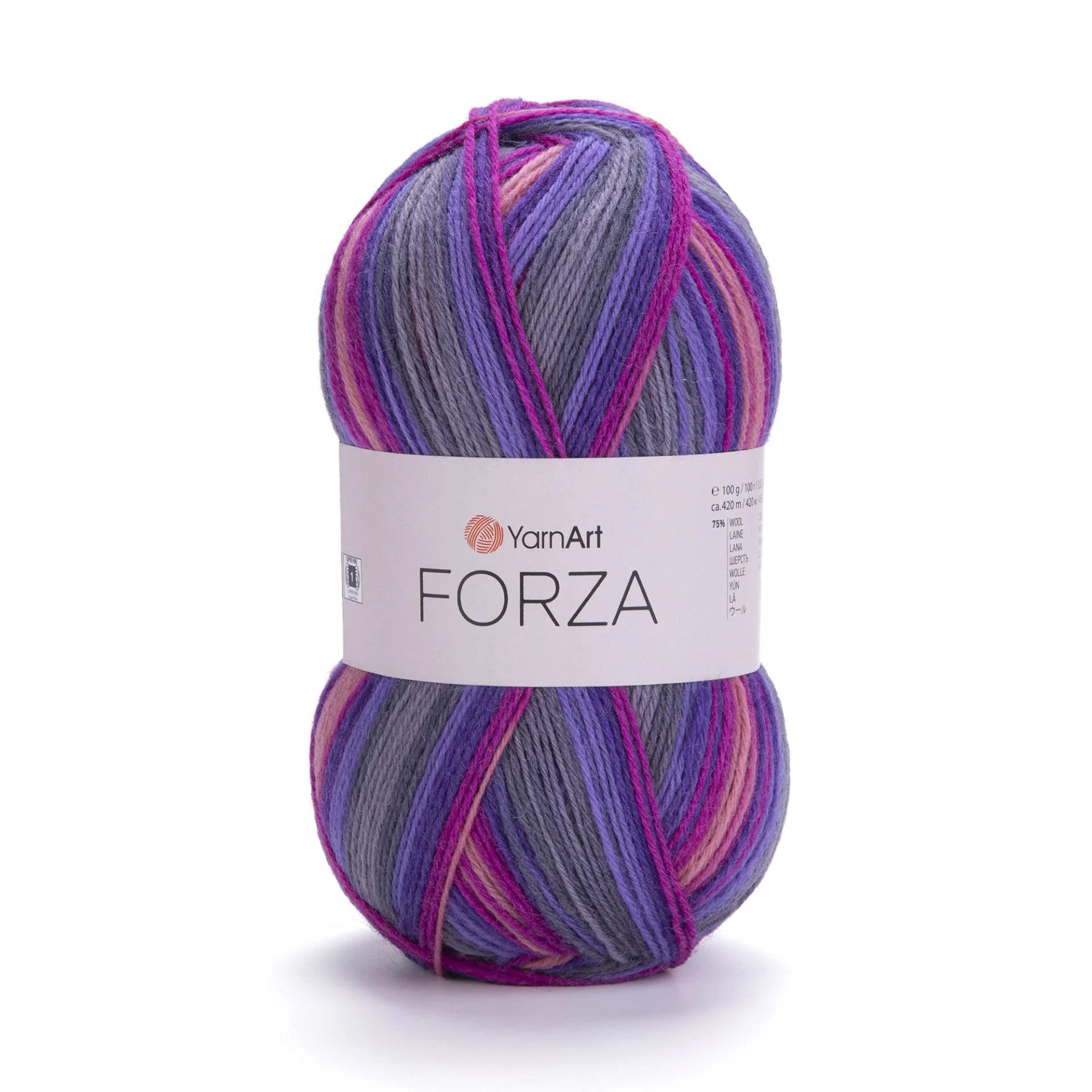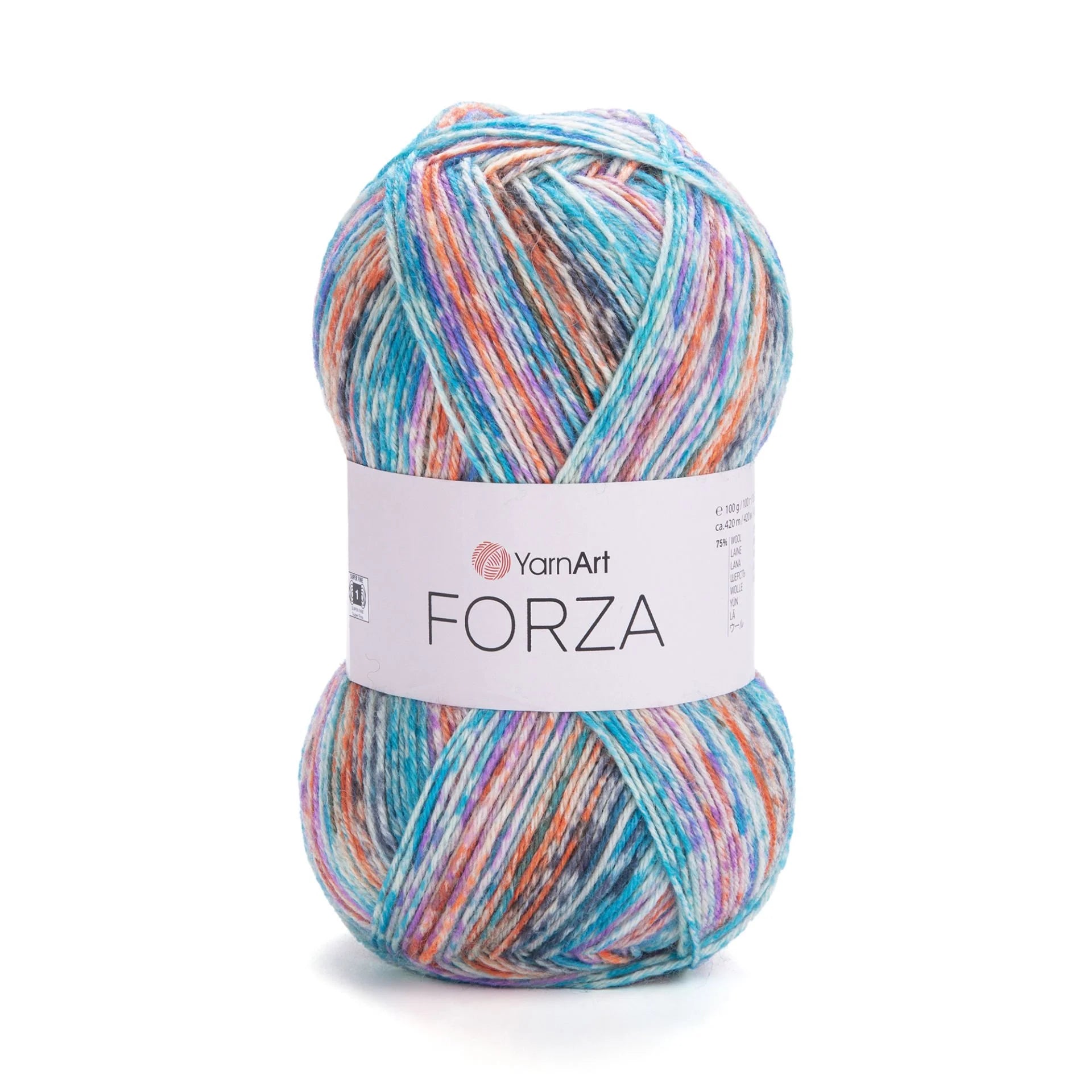 YarnArt Forza is a vibrant, effect yarn crafted from a fine 75% wool, 25% polyamide blend, with a generous 420 m per 100 g skein. Its super-fine gauge provides excellent stitch definition, making it ideal for colorful socks, shawls, lightweight scarves, and detailed layering combinations. The self-striping color transitions add depth, and slight variations may occur between dye lots—ordering enough yarn in one go ensures consistency.