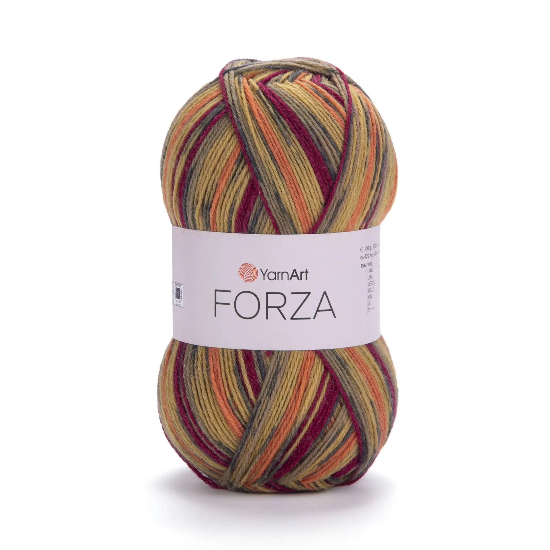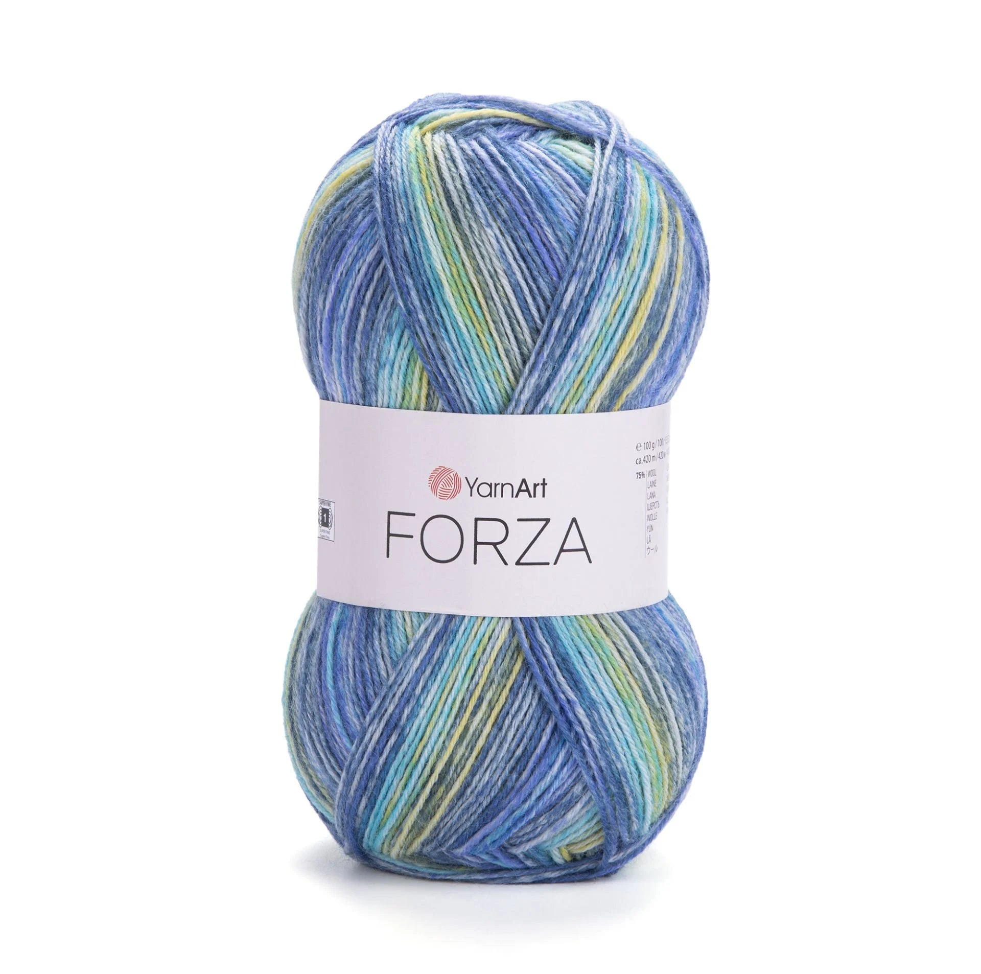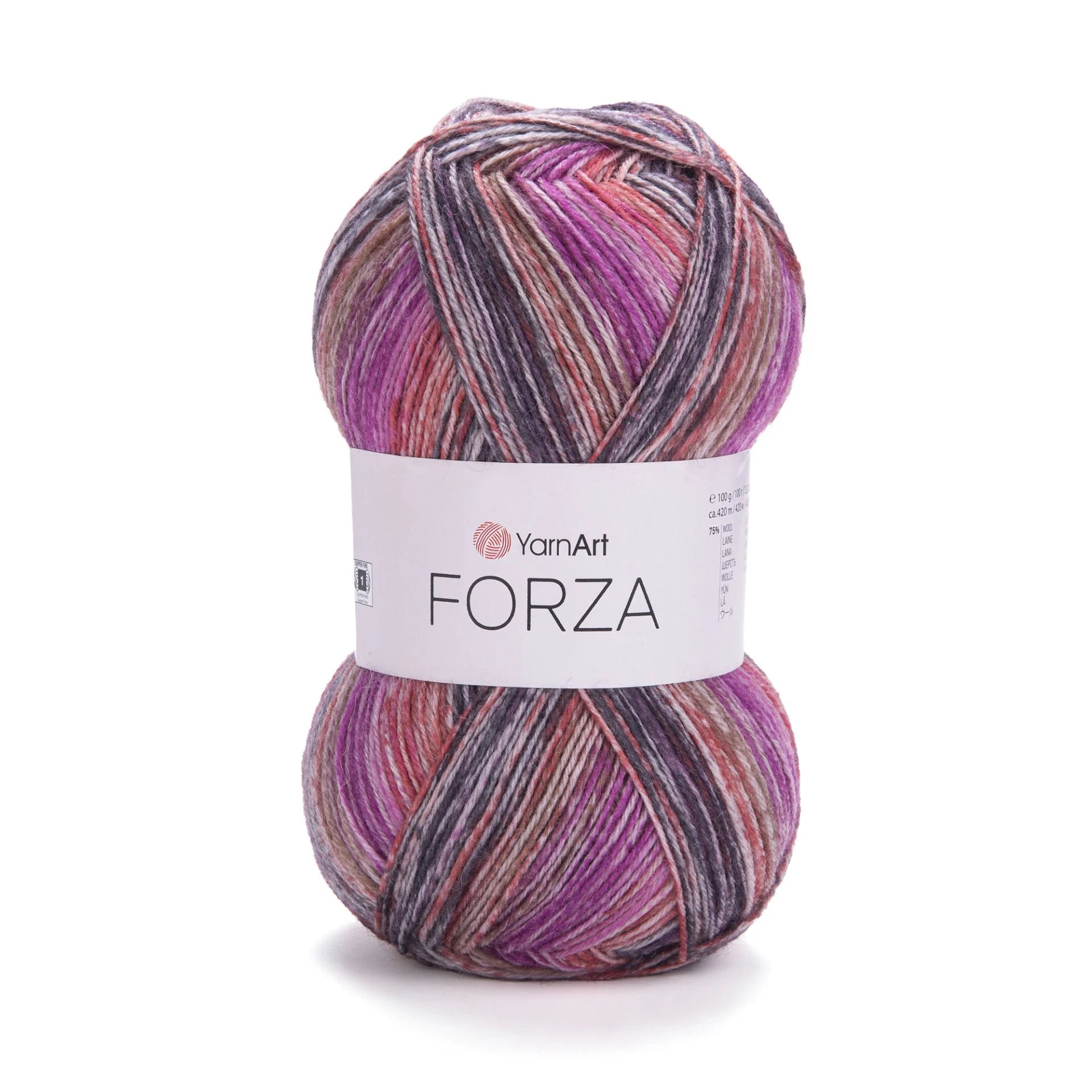 YarnArt Forza is a vibrant, effect yarn crafted from a fine 75% wool, 25% polyamide blend, with a generous 420 m per 100 g skein. Its super-fine gauge provides excellent stitch definition, making it ideal for colorful socks, shawls, lightweight scarves, and detailed layering combinations. The self-striping color transitions add depth, and slight variations may occur between dye lots—ordering enough yarn in one go ensures consistency.